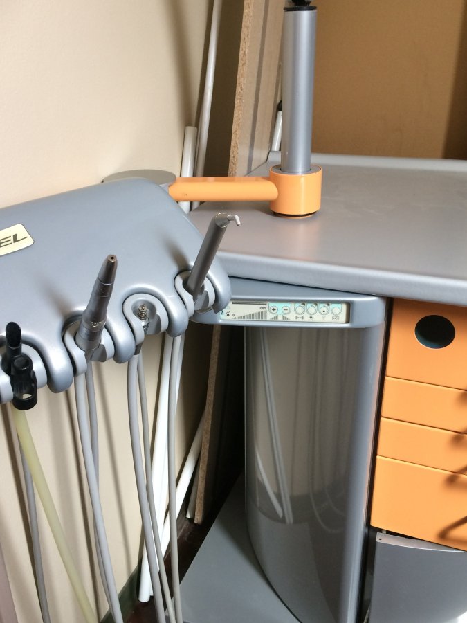 Unit Podo steel, 2009, piece à main, seringue air/eau, embout turbine (sans la turbine), aspiration. Lampe. Compresseur JunAir, tiroir avec lampe uv germicide. Bon état, bon aspect, fonctionne parfaitement, 1500 euro